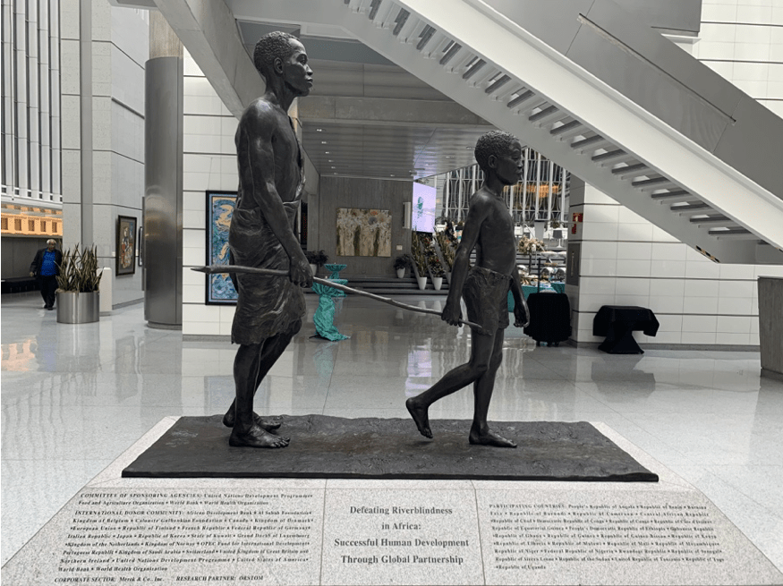 Sculpture at the Atrium depicting river blindness in Africa